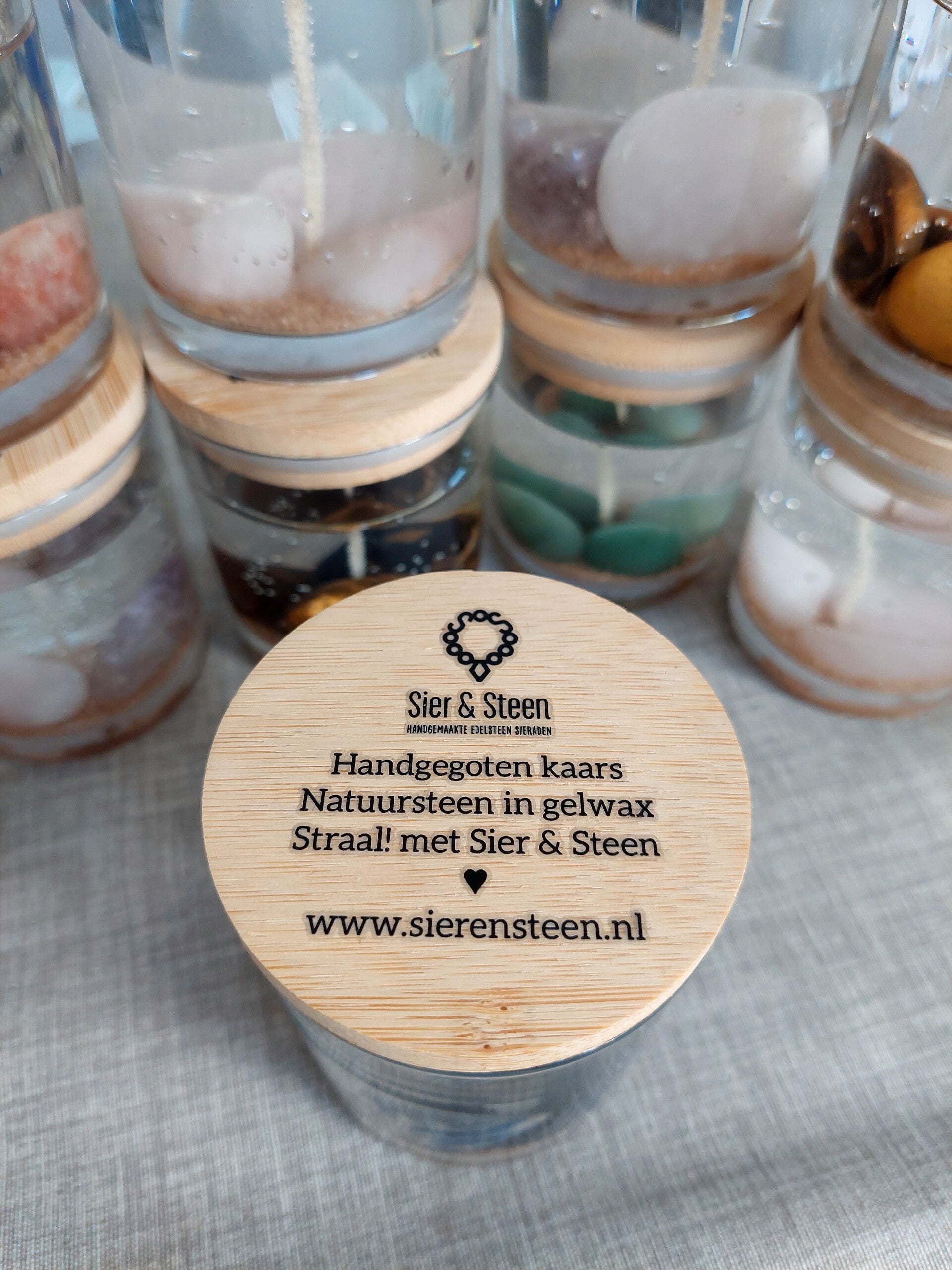 Handgegoten gelkaarsen, 3Dlijstjes om te gedenken en te motiveren, Pluche dieren met zorgensteen en meer... allemaal uniek en vol met de betekenis van natuursteen. Ook kun je in het voorjaar en de zomer toilettassen tegenkomen met een superleuke kortingsactie, tot wel 30%!